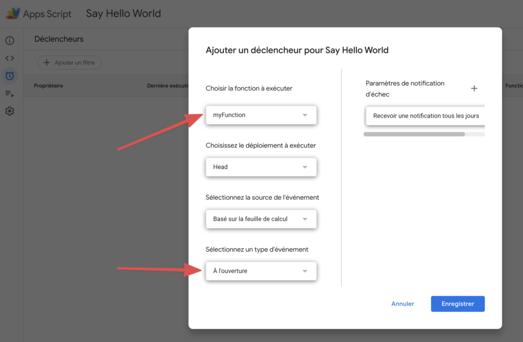 Vérifiez les informations, à savoir la fonction à exécuter et le type d’événement À l’ouverture. Enregistrez les paramètres et dans l’écran qui suit, vous devez donner l’accès de votre projet à votre compte Google.