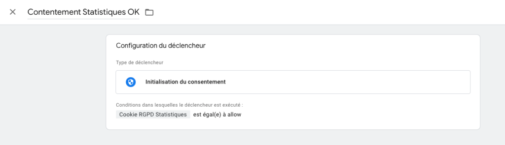 Nous allons créer un déclencheur qui s’activera à condition que la valeur récupérée dans la variable Cookie RGPD Statistiques soit égale à allow, qui est l’enregistrement du consentement utilisateur à être suivi au niveau des statistiques Google Universal Analytics.